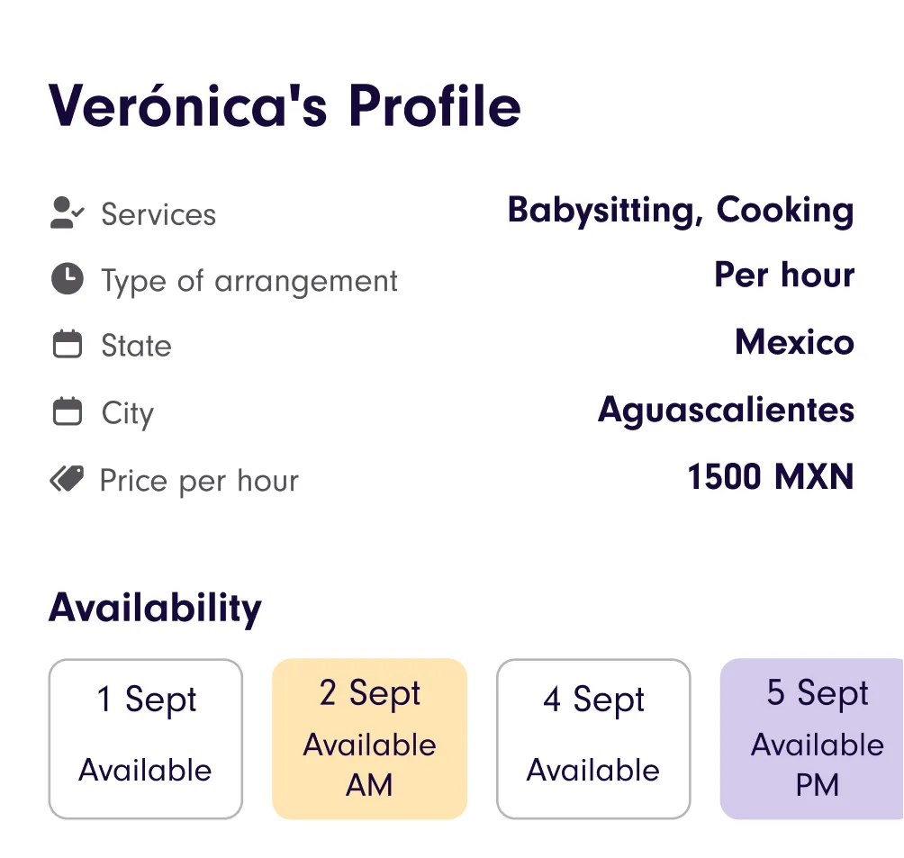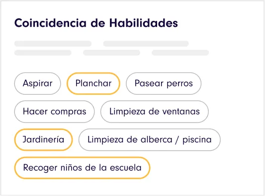 - Filtros por habilidades: busca trabajadoras que sepan planchar, cocinar, cuidar personas, etc.