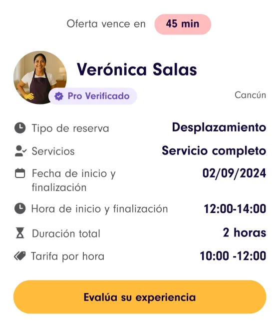 Tú acuerdas el precio directamente con la trabajadora por medio de la app.Yazta solo cobra una pequeña tarifa por uso de la plataforma cuando confirmas la reserva. Todo lo que se acuerda y confirma dentro de la app está protegido.Evita negociar fuera de Yazta, ya que eso no está cubierto por nuestro soporte.