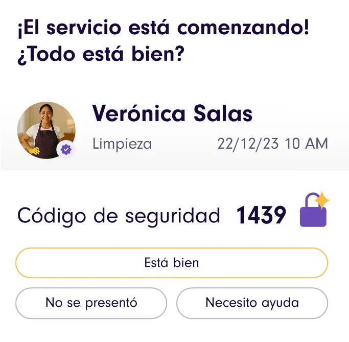 Todas las trabajadoras deben verificar su identidad y documentos para aparecer en la app.Además, Yazta usa un Código de Seguridad: antes de que la trabajadora entre a tu casa, deberás darle un código único que aparece en la app.Así aseguramos que estás recibiendo a la persona correcta.