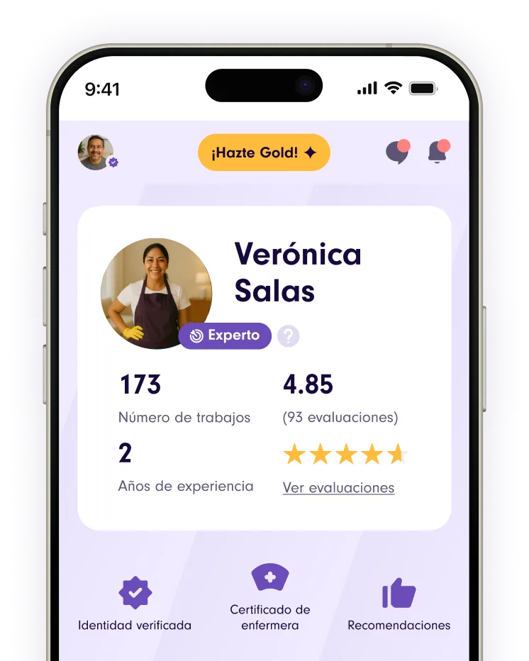 Las insignias te ayudan a conocer mejor a las trabajadoras. Muestran su experiencia, habilidades y confianza. Puedes usar las insignias para filtrar tu búsqueda y elegir con más seguridad. Las trabajadoras obtienen insignias al verificar su identidad, recibir buenas calificaciones, o subir cartas de recomendación. También hay una insignia especial para enfermeras certificadas.